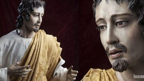 El imaginero lucentino Francisco Javier López del Espino ha entregado recientemente este soberbia imagen de San Juan Evangelista. Se trata de una talla de tamaño natural, realizada en madera de cedro y policromada al óleo, que fue bendecida el pasado 2 de marzo. Es la primera figura que realiza para el paso de misterio del traslado al sepulcro que el artista lucentino está realizando para la Semana Santa de Ciudad Real.