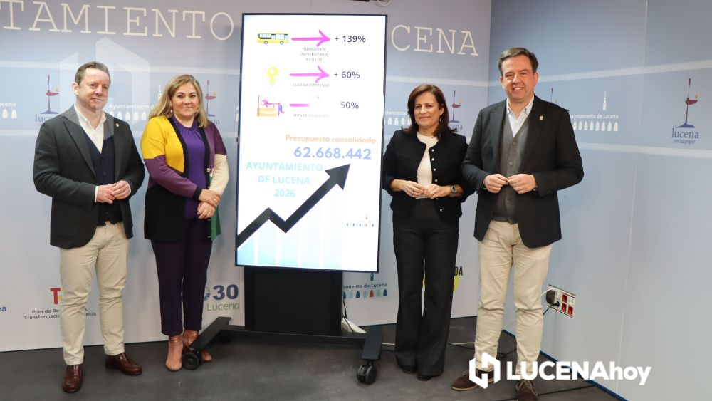 El presupuesto municipal asciende a 57.010.445 euros, un 2,2 % mas que el ejercicio actual. La cifra se eleva a 62.668.442 euros en su consolidado, incluyendo las cuentas de las tres empresas municipales: Aguas de Lucena, EPEL y Suvilusa. Estas cuentas, en palabras del alcalde, nacen sobre tres pilares: orden, estabilidad y rigor, y sientan las bases para comenzar con las intervenciones incluidas en el nuevo Plan de Actuación Integrado (PAI), con vigencia hasta 2029.