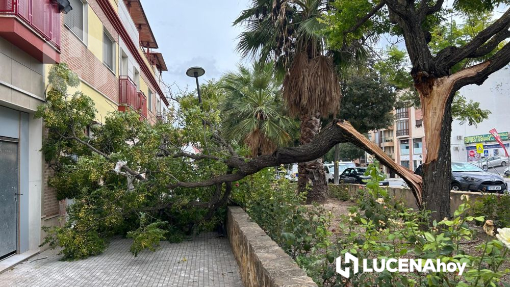 A pesar de que el viento aún no ha registrado la intensidad prevista durante la mañana, sí ha provocado caídas de las primeras ramas en distintas zonas ajardinadas. En la Avenida de la Guardia Civil, una rama de gran tamaño se ha desprendido de un árbol, impactando contra el acerado y la fachada de un bloque de viviendas. El incidente solo ha causado daños materiales menores, entre ellos la rotura de una farola cercana.